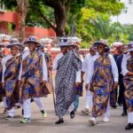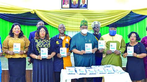 The-then Executive Chairman, Lagos State Universal Basic Education Board (LASUBEB), Wahab Alawiye-King (4th from left), initiator of the Eko Poems Project, Ola Awakan; Chairman, Lagos State Branch of the National Association of Nigerian Theatre Arts Practitioners (NANTAP), Adeniran Makinde (3rd from right) flagged by LASUBEB officials at the unveiling of Eko Poems, an anthology of nursery rhymes in 2021. Picture Credit: The Guardian